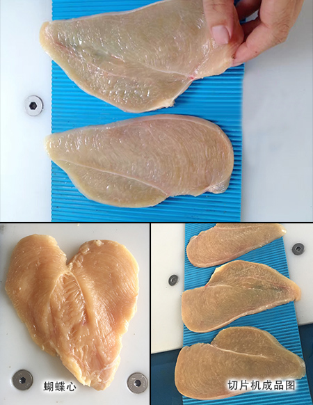 ·通过更换刀具实现鸡胸肉蝴蝶心的切割加工,浮动的上网带设计,适合不同厚度的肉块,可以设计成多层不同的厚度;