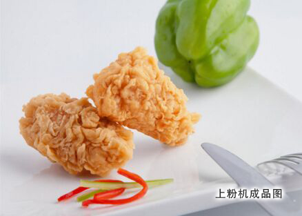 通过滚筒的转动,将产品表面裹上一层均匀的裹粉,以增加产品的上粉量,产生鳞片状的形态。适用于块状或不规则物料的上粉(面包屑)。如:鸡米花、鸡块、鱼块、鸡柳条等。
